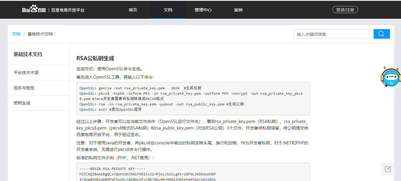 1.登录百度账号,在开发者平台-找到运营中心-支付管理-申请开通后,填写相关信息,需要填写的公钥,点击下面的“查看密钥规则”根据说明获取,填写完成即可提交,提交后等待百度审核,点击查看,可以看到整体的信息,其他操作和百度小程序的标准版的操作一致这里不再赘述。